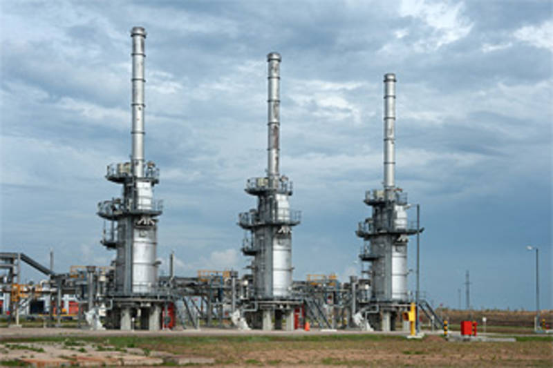 The Karachaganak Processing Complex processes oil condensate from 44 production wells and from Unit 2. Oil and gas are separated through slug-catchers. The oil feed is treated by four stabilisation trains and pumped into the export pipeline to Atyrau for sale on international markets. Completed in 2011 the fourth liquids stabilisation and sweetening train was designed to increase the production of stabilised and sweetened liquids to high value western markets.